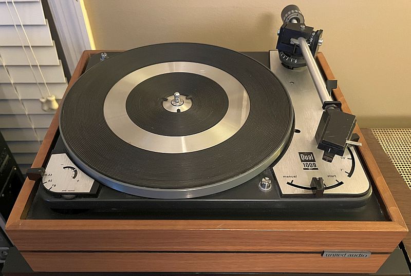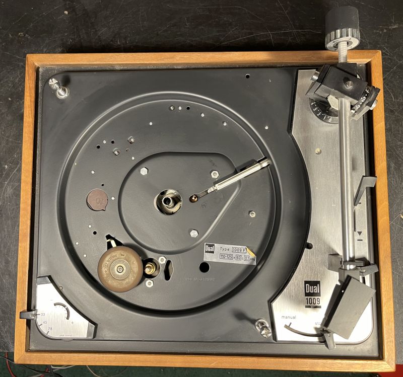 This is a Dual Model 1009F Auto/Professional Turntable manufactured in the late 1960's. It is mounted on a United Audio wooden base.