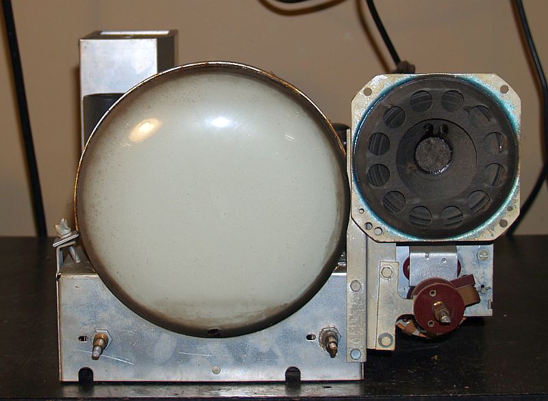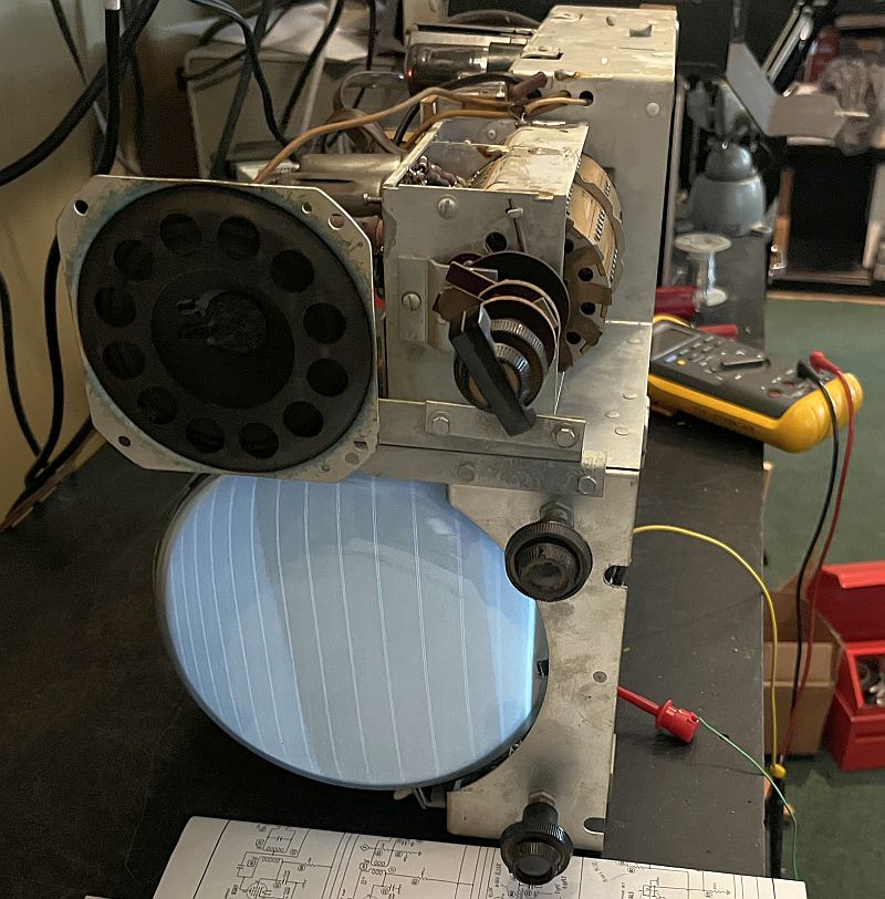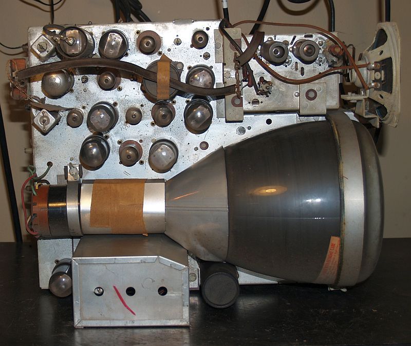 Below are pictures of the chassis removed from the cabinet. Note that there is not much dust on the chassis.The front of the picture tube has some grime on it.