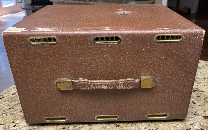 The television is a portable device housed in a wooden cabinet covered with a brown cloth-type fabric. There is a handle on one side for carrying and feet on