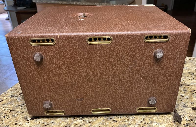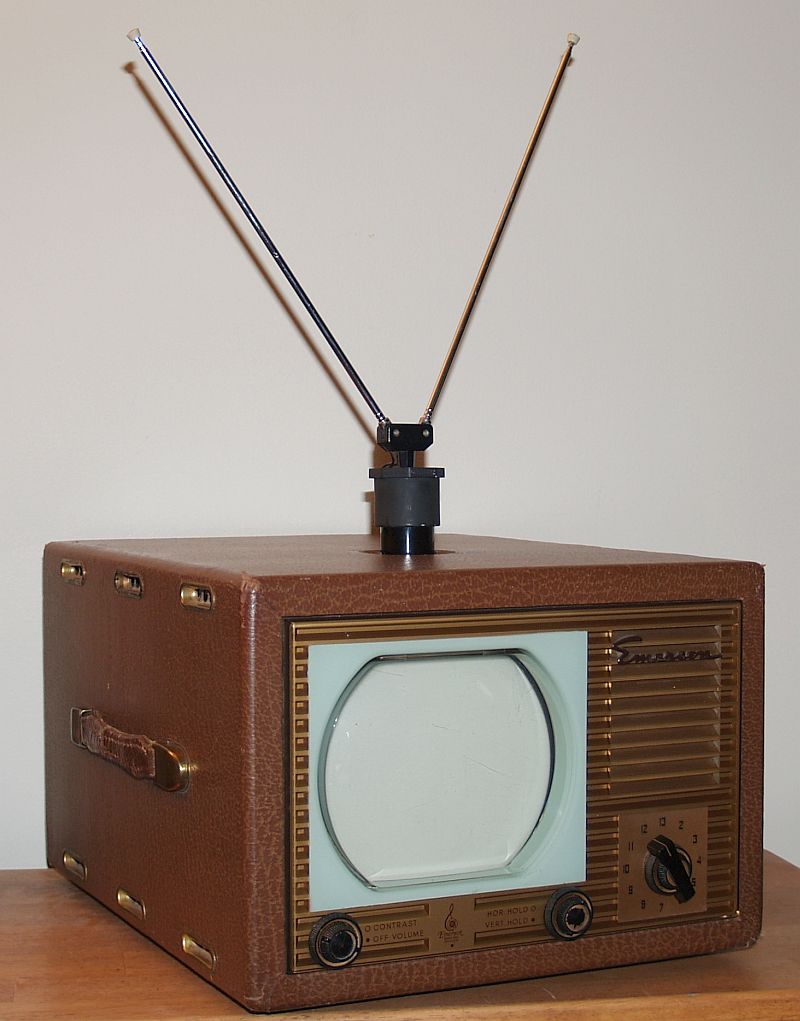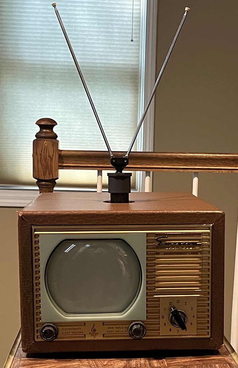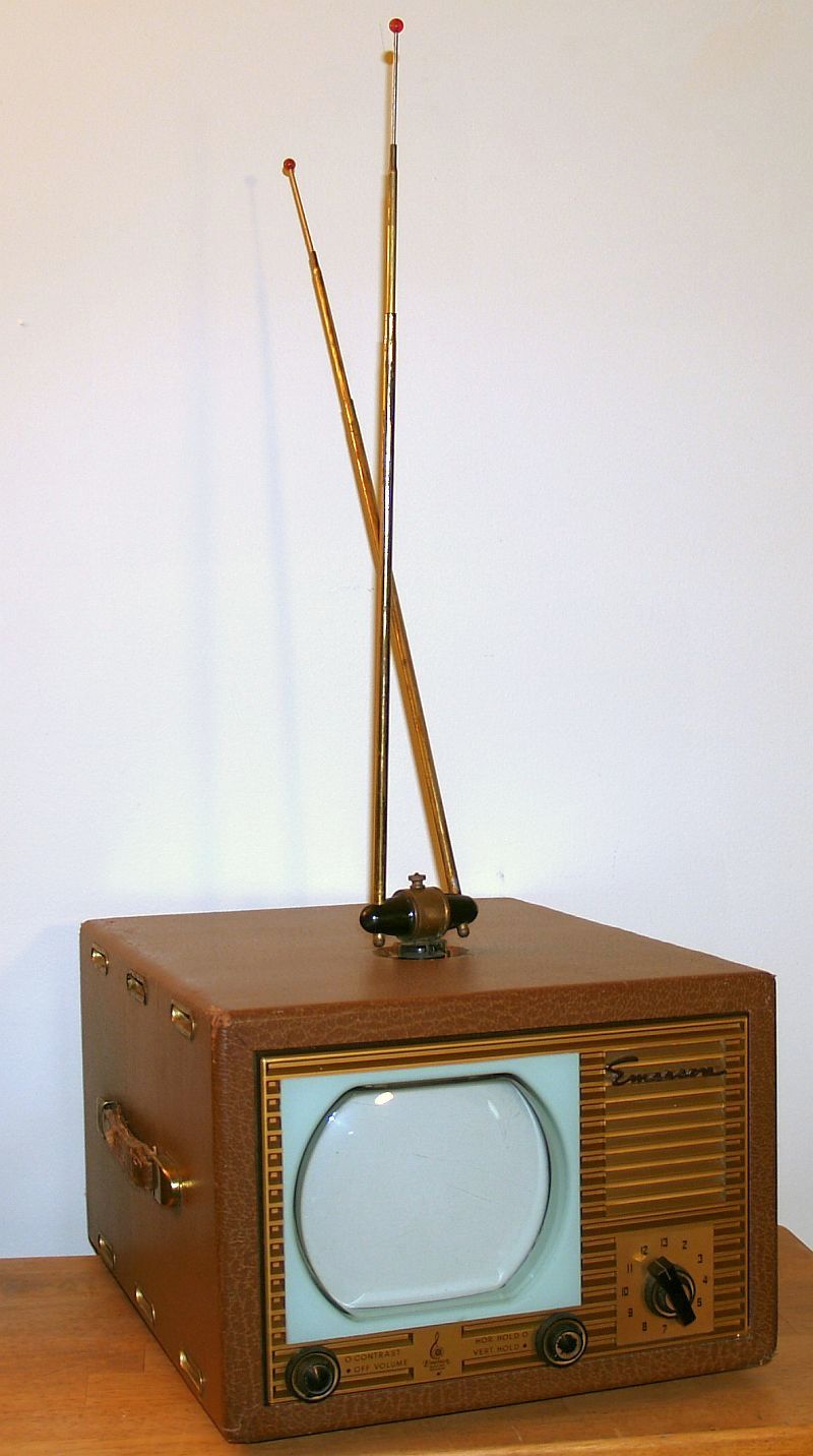 The top has has 4-pin tube socket for attachment of a removable "rabbit-ears" antenna. The original antenna is often missing. A short run of 300-ohm TV twin lead