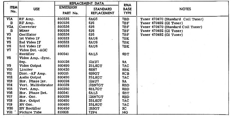 Below is a list of the vacuum tubes in television from the SAMS Photofact. The listing covers two different tuner models that may be installed. There is only one 6J6 converter tube (V2) in
