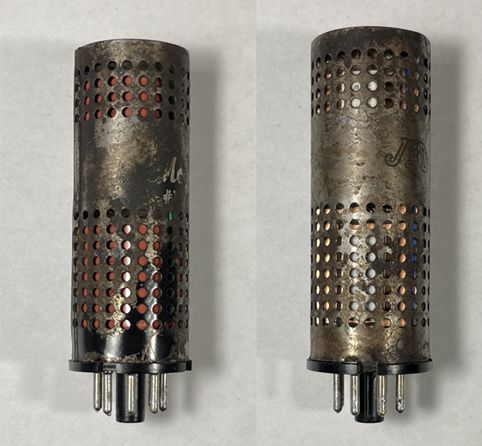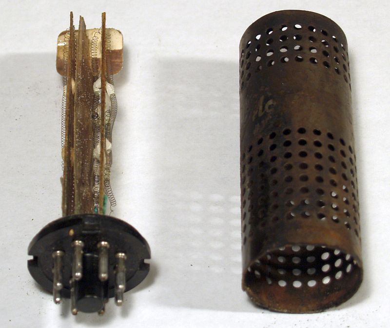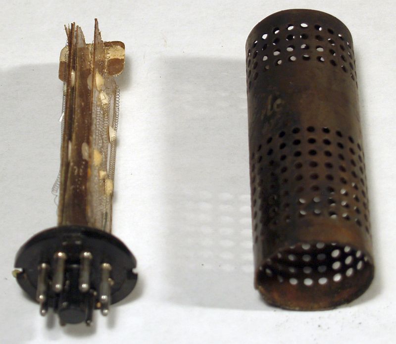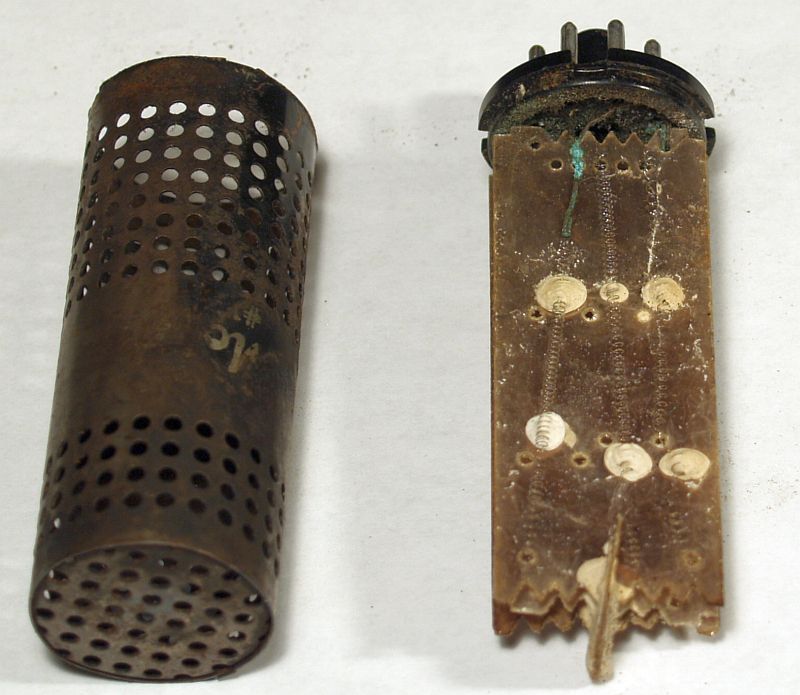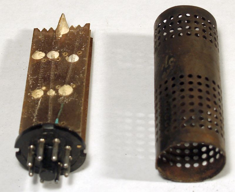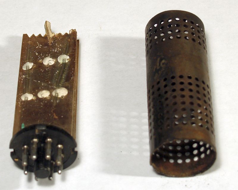 The 25L6GT beam pentode vacuum tube that implements the high voltage oscillator is shown on the left and resides outside the metal cover. The 1B3GT high