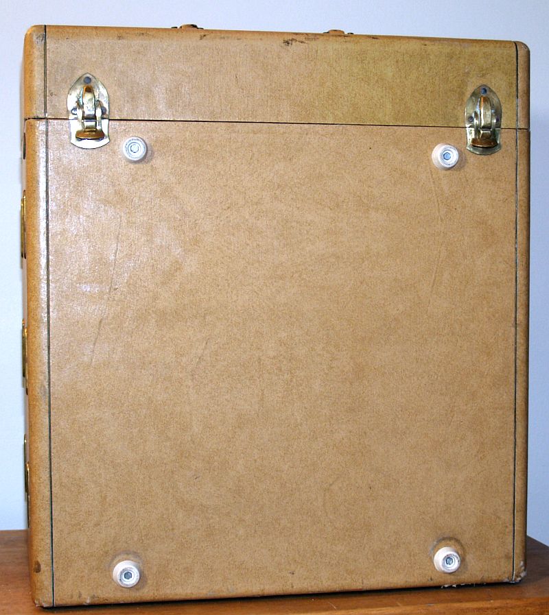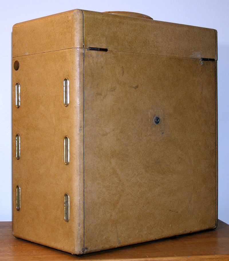 The television is a portable device housed in a light tan leatherette-covered cabinet