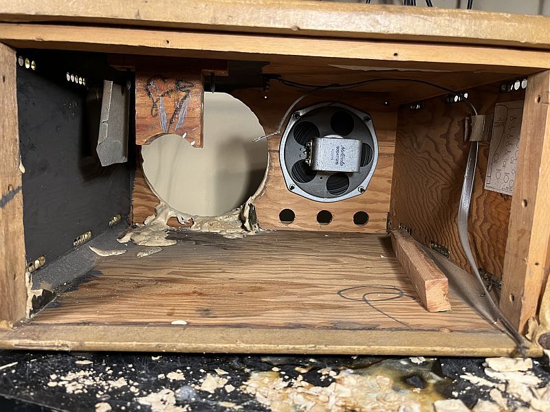 picture below shows the cabinet with the CRT removed. You can see the hardened material stuck to the cabinet.