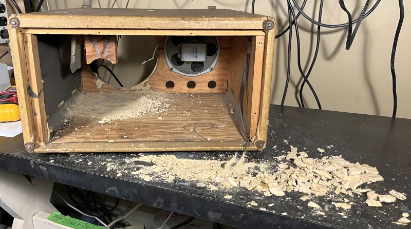 waterlog the wooden cabinet that is held together with glue. This took some time. It required repeated applications of water, carving out the material with a hobby knife, carving pockets to