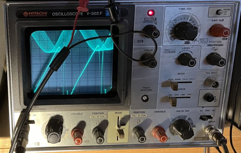 sawtooth ramp signal as shown below. It is difficult to measure the frequency of a sawtooth with a frequeny counter. As such, I input a 15,750 Hz sinewave signal on one channel of