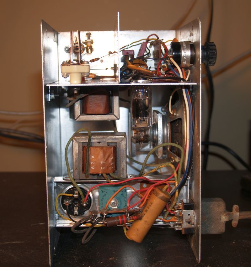 The transceiver uses three vacuum tubes. A 6AF4 vacuum tube operates as a superegenerative detector and the oscillator for the transmitter. For audio on both transmit and