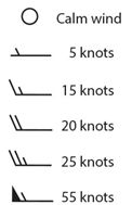 Wind speeds on weather maps are in knots (kt); one knot equals 1.15 mph and 1.85 km/h. Each long barb represents 10 kt and short